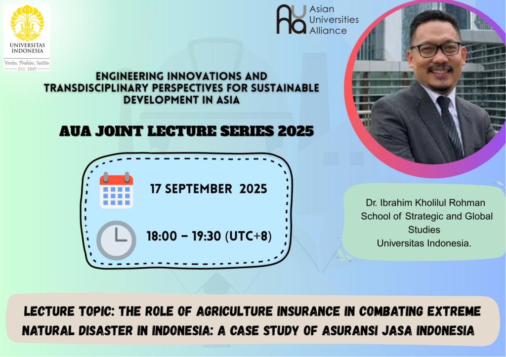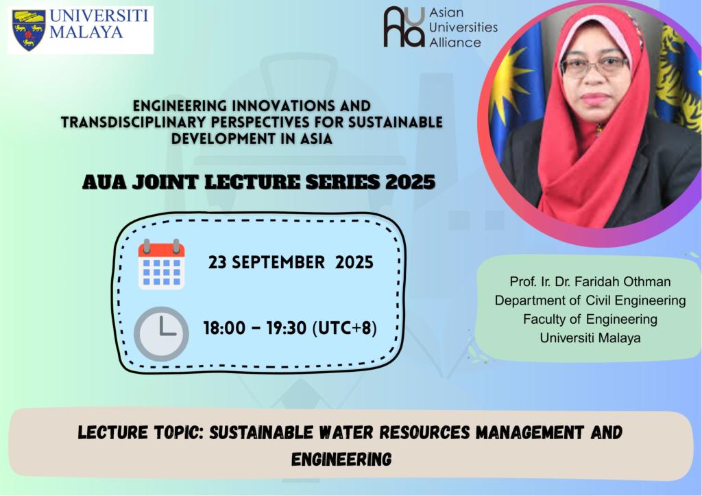 The theme of this year’s AUA Joint Online Lecture Series is “Engineering Innovations and Transdisciplinary Perspectives for Sustainable Development in Asia.”The 2025 JLS will explore how engineering can drive sustainable development while embracing transdisciplinary collaboration to address complex, interconnected challenges in Asia. In today’s rapidly evolving world, engineering innovations are pivotal in tackling social, economic, and environmental issues. Yet achieving impactful, sustainable change requires diverse disciplines to work hand in hand. Through this lecture series, renowned experts from AUA member universities will share their experiences, research, and practical knowledge on a broad range of sustainable development topics.